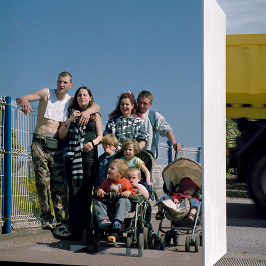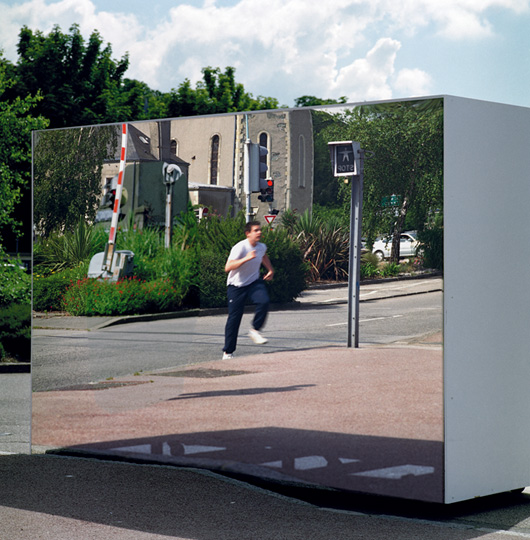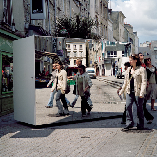 Ils posent aussi la question de l’hospitalité. Hospitalité de la ville de Cherbourg mais également de ma propre pratique photographique. J’en viens à concevoir un dispositif photographique où les images produites ne sont pas retranchées dans l’appareil mais entièrement réfléchies dans l’espace public. Je fabrique un caisson réfléchissant, une chambre-miroir que je promène dans les rues de Cherbourg et devant laquelle les passants sont invités à poser à la manière d’un studio ambulant. Ce dispositif produit une contrepartie immédiate pour les personnes photographiées en leur renvoyant leur image. Les portraits réalisés ne sont que des images dérivées d’images déjà réfléchies dans l’espace public. Photographies sans primauté dont le négatif ne serait en quelque sorte jamais entré dans l’appareil, n’aurait jamais été mis en boîte.